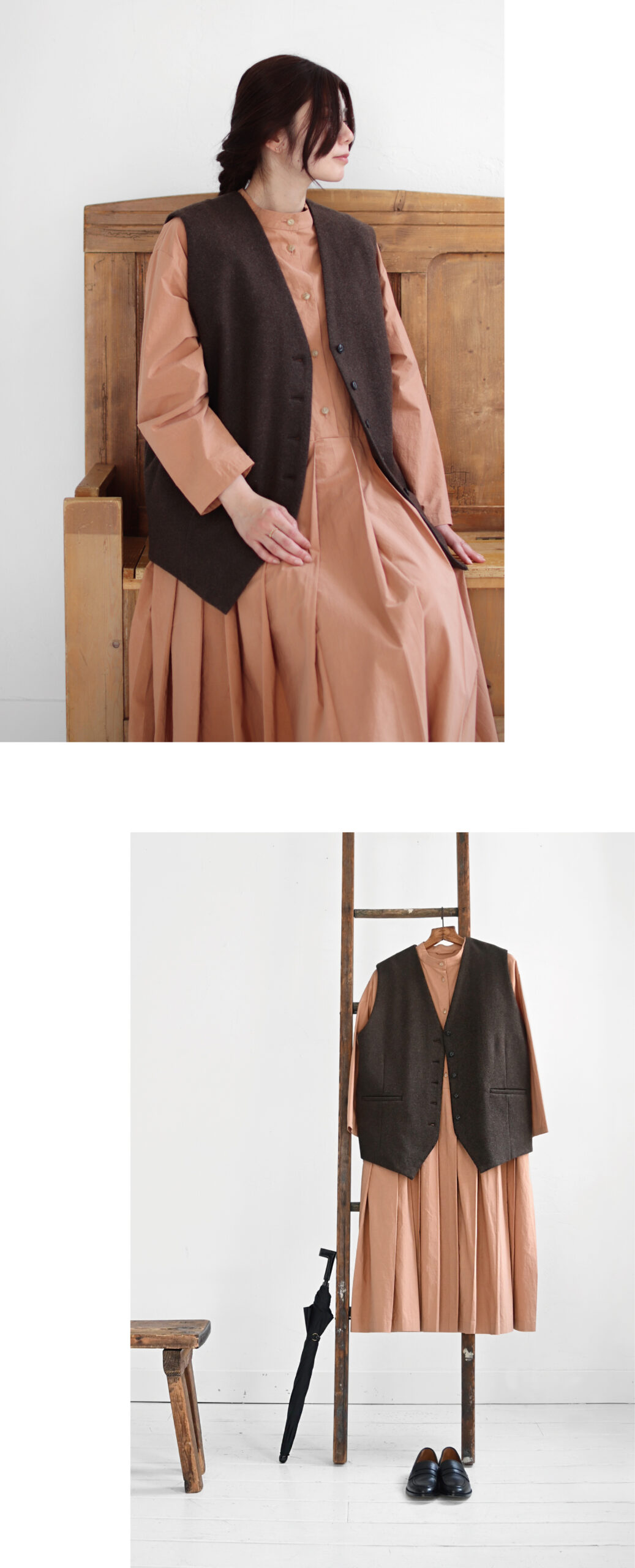 Vest 53,900 , Dress 58,300 , Umbrella 19,800 / Atelier d’antan , Shoes 42,900 / DIVINA